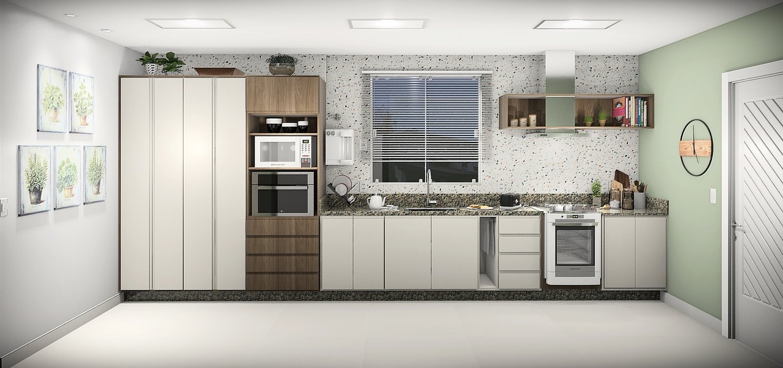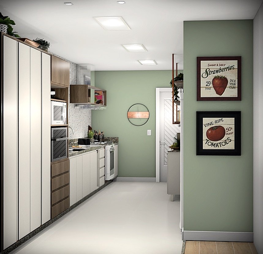 A escolha de cores claras, com o amadeirado e o verde nas paredes, proporciona uma atmosfera leve e convidativa. Essas tonalidades trazem uma sensação de frescor e harmonia ao ambiente, ao mesmo tempo em que se integram perfeitamente ao estilo contemporâneo desejado. Um destaque especial foi dado à área da bancada, revestida com granilite, que confere uma textura única e adiciona um toque de sofisticação à cozinha.