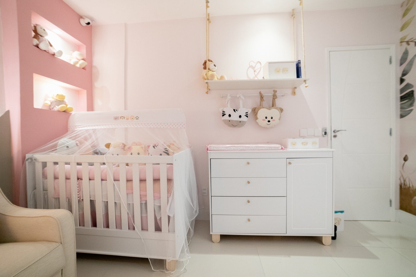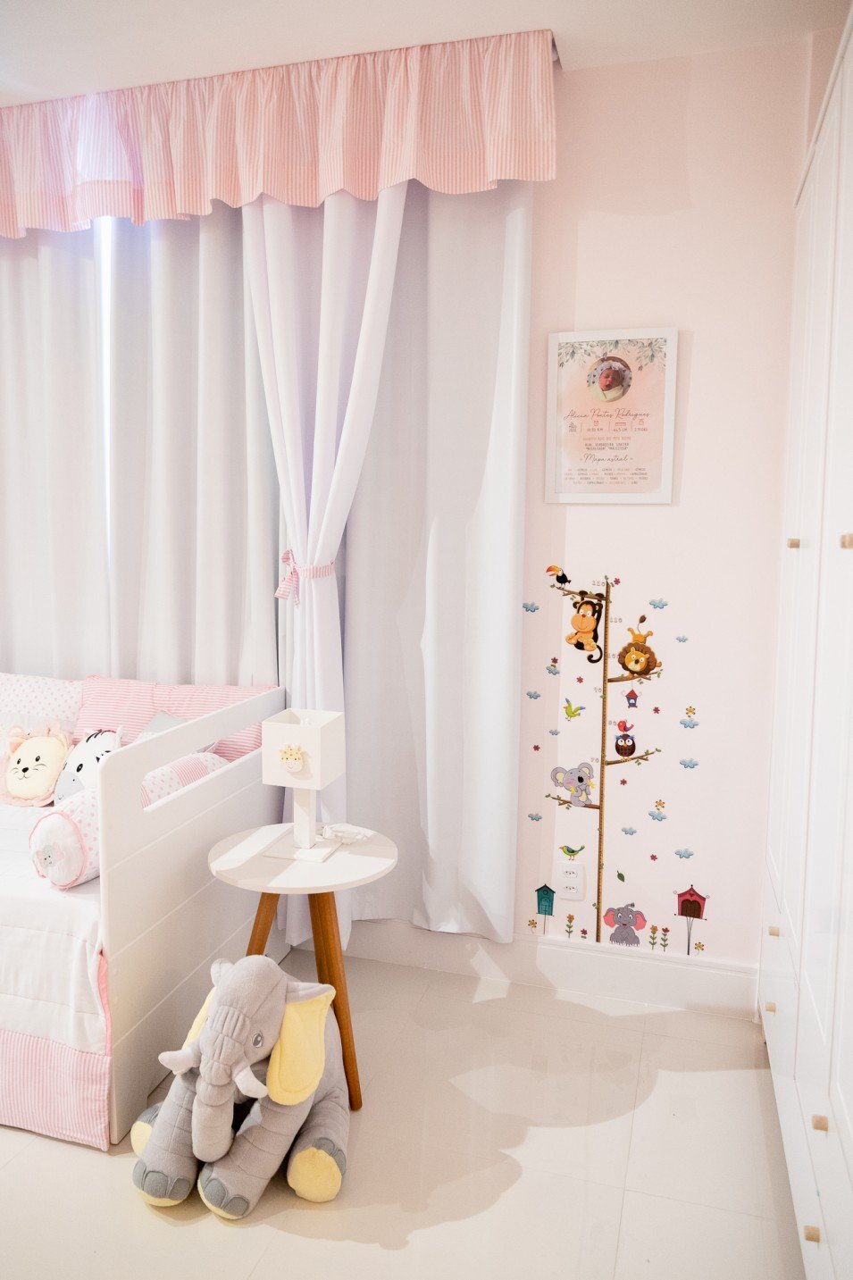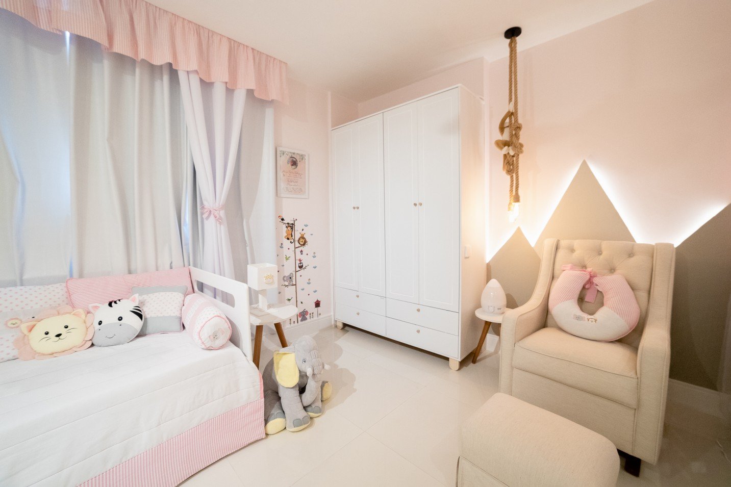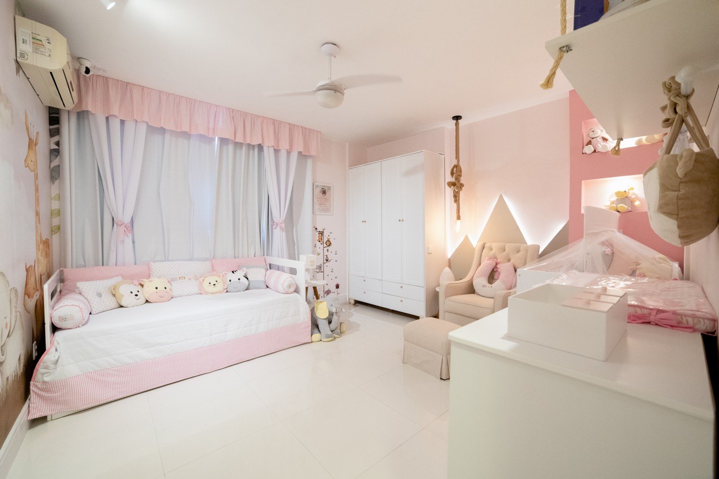 O resultado final é um quarto de menina encantador, onde a paleta de cores suave se harmoniza com os elementos lúdicos do tema safari. A combinação do mobiliário branco, o destaque do papel de parede e os detalhes cuidadosamente escolhidos contribuem para um ambiente acolhedor e inspirador para a pequena criança.