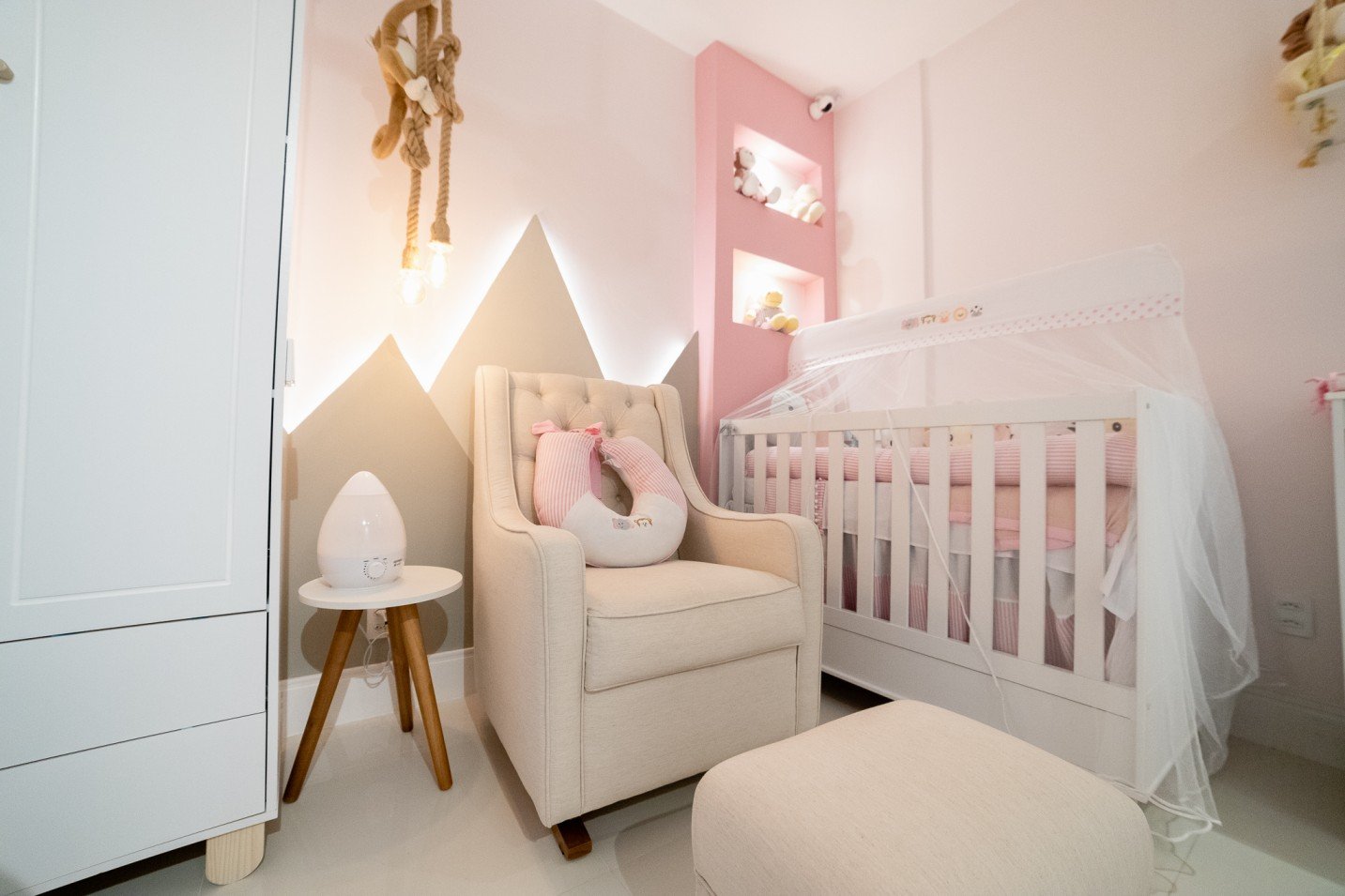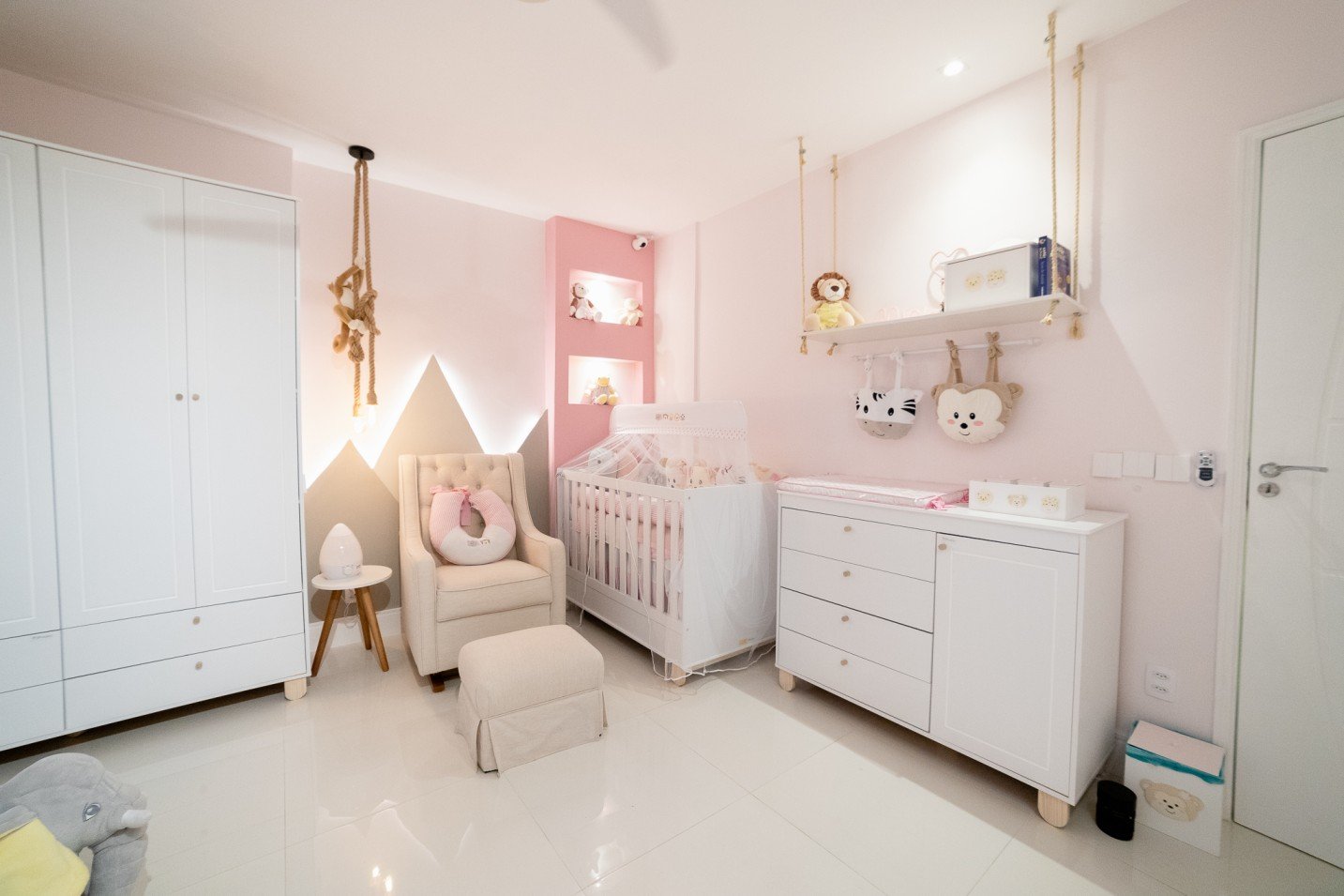 Na área reservada para a amamentação, foi criado um detalhe com iluminação que remete a montanhas ao fundo, trazendo um toque de serenidade e tranquilidade. Além disso, nichos em drywall, também iluminados, foram utilizados para exibir brinquedos de pelúcia, criando um visual atrativo e organizado.