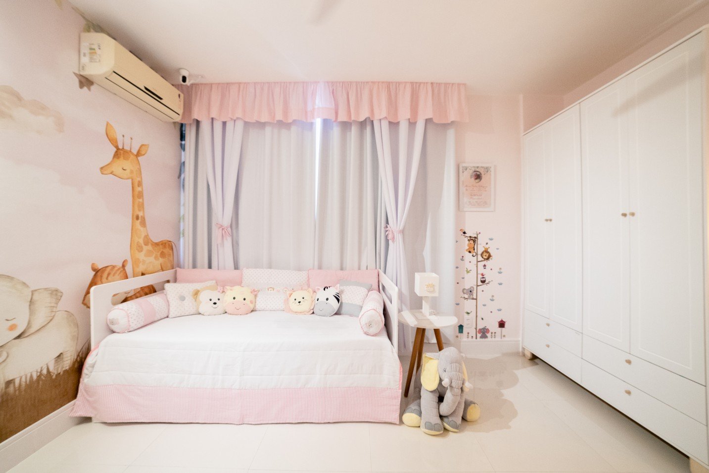 O quarto de menina deste casal foi projetado com um tema não convencional: safari. A escolha desse tema trouxe uma atmosfera lúdica e divertida para o ambiente, sendo perfeito para a primeira filha do casal.