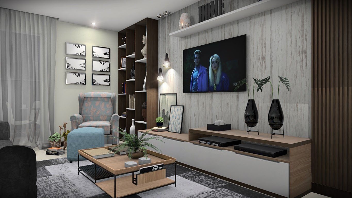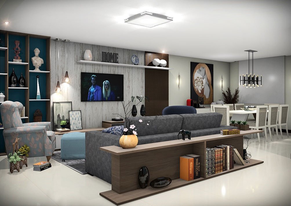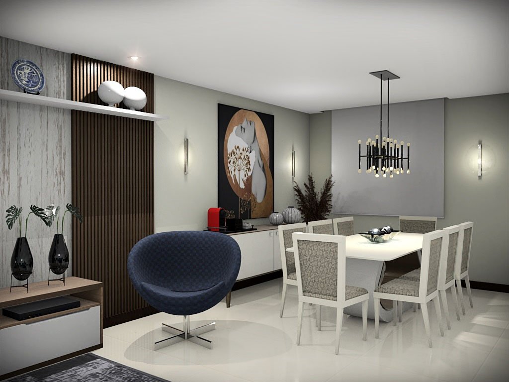 Neste projeto, alcançamos a harmonia perfeita entre as salas de jantar e estar, criando uma integração fluida e sofisticada. A composição cuidadosa dos tons de cinza e azul trouxe uma elegância atemporal, enquanto a presença da madeira adicionou um toque de requinte aos ambientes.