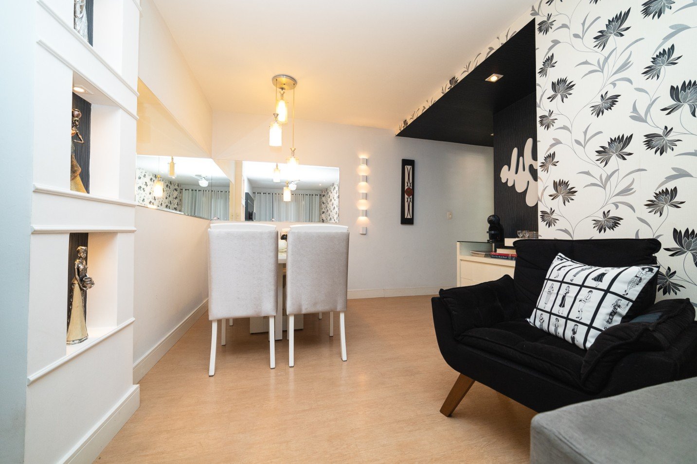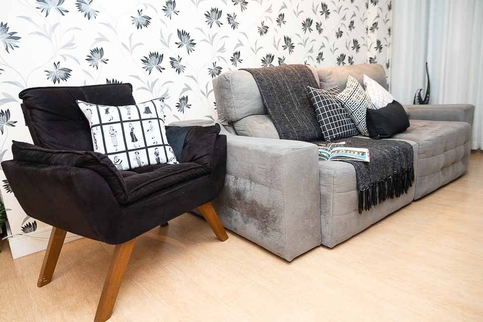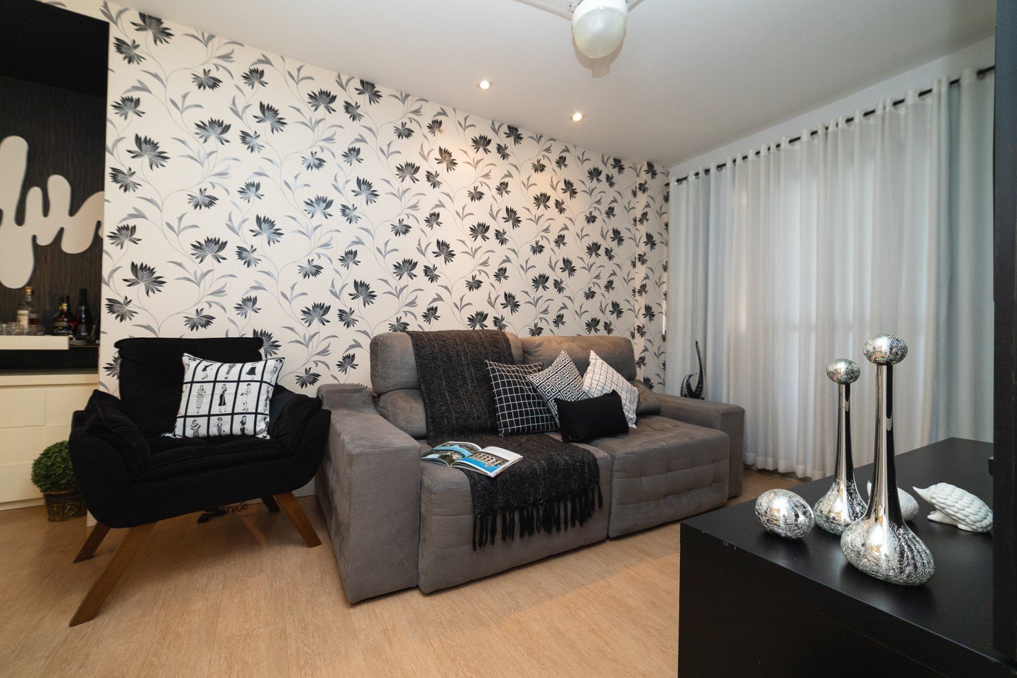 Além disso, a sala conta com um papel de parede elegante, com detalhes também em preto. Esses elementos adicionam personalidade e estilo ao espaço, criando uma atmosfera visualmente impactante.