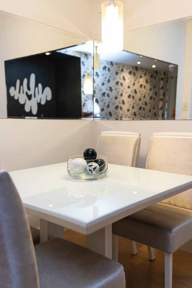 Nas salas integradas deste projeto, buscamos criar uma atmosfera sofisticada e contemporânea, utilizando uma composição de tons de cinza, branco e preto. O mobiliário escolhido é elegante e moderno, agregando estilo aos espaços. O espelho em L na sala de jantar, dá profundidade e amplitude ao ambiente.