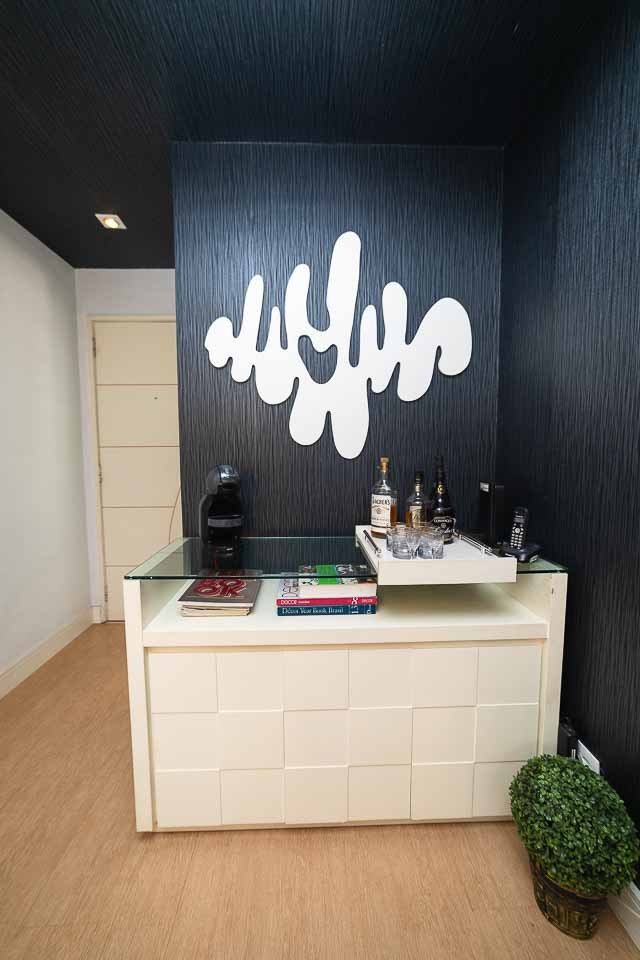 Um dos destaques é o espaço do bar, que foi cuidadosamente projetado para se destacar. Utilizamos um papel de parede texturizado preto, que cria uma base perfeita para o ambiente. Sua textura adiciona profundidade e sofisticação, enquanto o tom escuro traz um toque de drama e elegância.